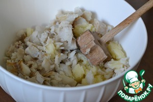 • В отдельной миске толкушкой размять вместе картофель и филе рыбы.