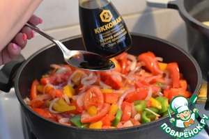 • Добавить вино. Довести до кипения, убавить огонь и тушить 15 минут. Затем добавить соевый соус