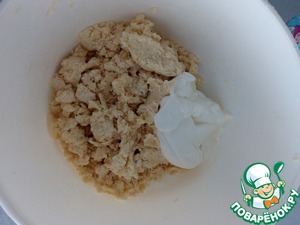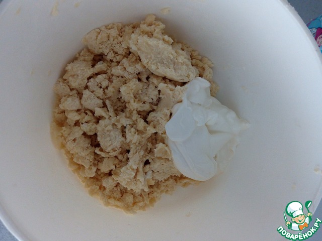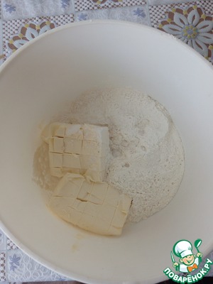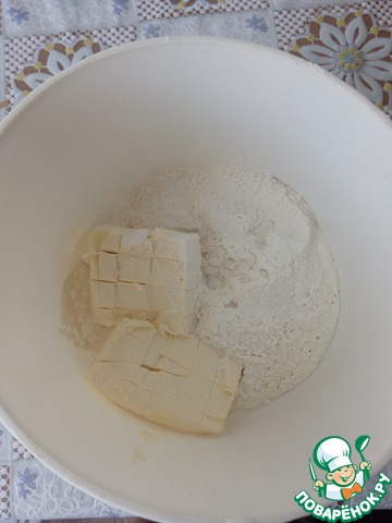 Охлажденное масло, соду и соль добавляем в муку, месим до образования крупной крошки.