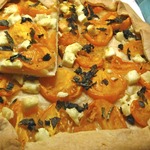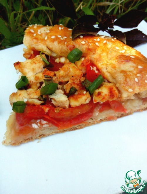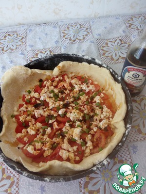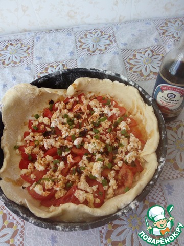 Тесто раскатываем, выкладываем на подпыленный мукой противень. Помидоры режем полукругом, сыр крошим, базилик рвем, лук режем, поливаем соевым соусом и немного сметаной.