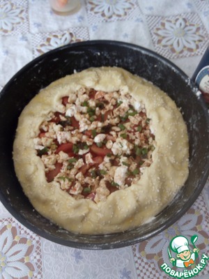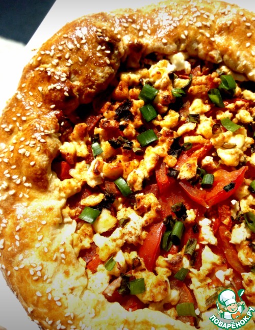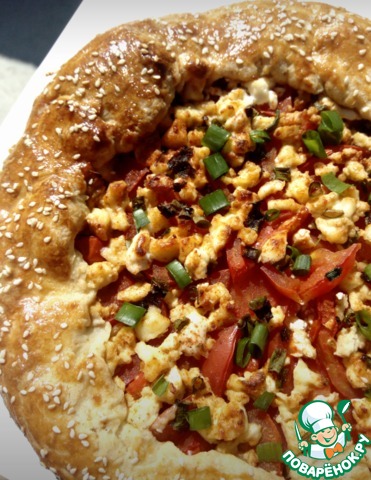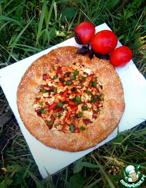 Края пирога заворачиваем, смазываем желтком и посыпаем кунжутом.