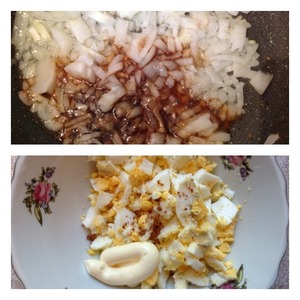 Когда лук станет мягким, но еще не румяным, добавить сахар и соевый соус. Жарить до карамелизации лука. Яйца нарезать тем временем кубиком не очень крупно, добавить острый молотый перец и майонез/ сметана по вкусу. Начинку перемешать.