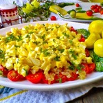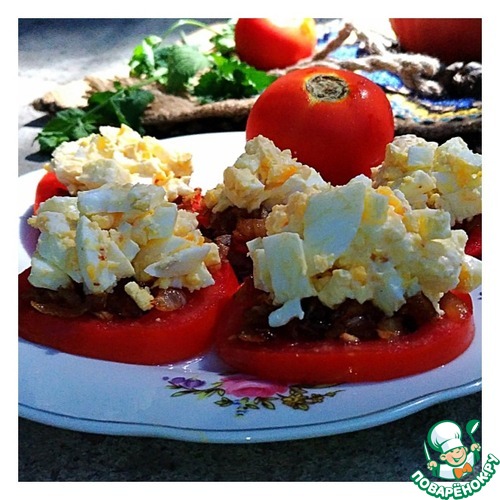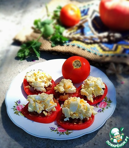 Помидоры нарезать кружочками и выложить на тарелку. Сверху выложить обжаренный лук и яичную начинку. Можно украсить зеленью.