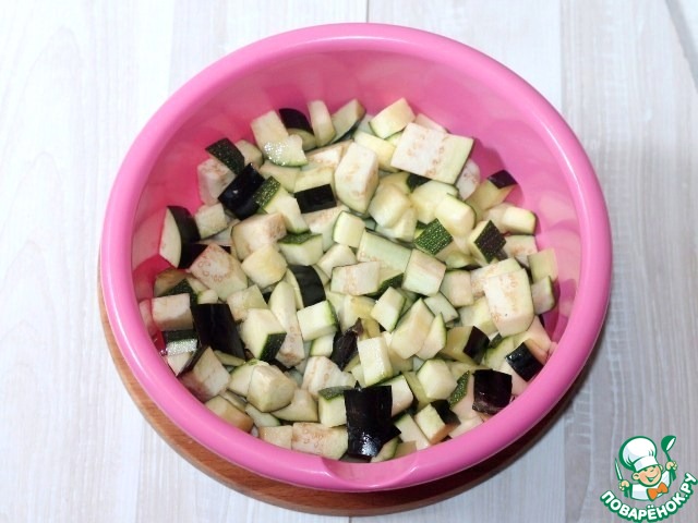• 1. Вымыть кабачок и баклажан, отрезать плодоножку и огрубевшую мякоть с верхушки, порезать кубиками.