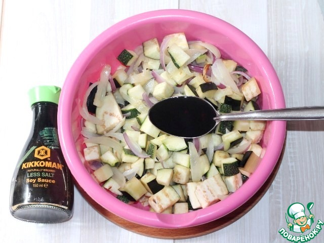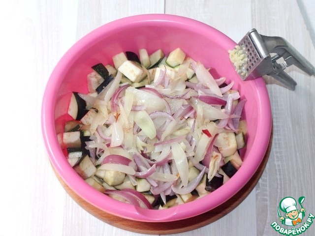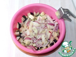 • 3. В миску к овощам добавить обжаренный лук, прессованный чеснок,...