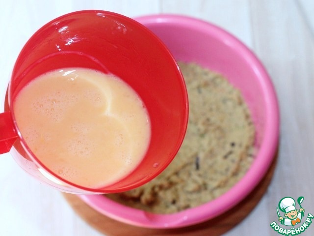 • 6. Добавить в овощную смесь по 1 щепотке сухой приправы, перемешать. Затем вмешать по 1 ст. ложке блинную муку. Тесто должно быть густое, как на оладьи.