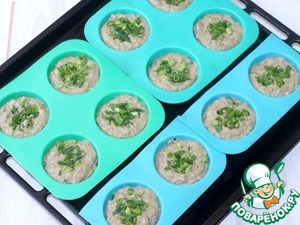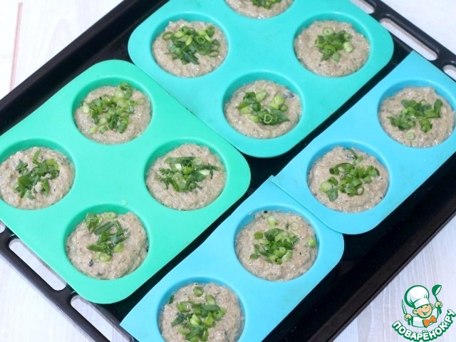 • 7. Разложить овощную смесь в силиконовые формочки (маслом не смазывать) и посыпать мелко порубленным зеленым луком. Выпекать в заранее разогретой до 180 С духовке до готовности, ~30 минут. Через 30 минут проверяйте на сухую спичку.