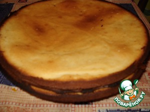Не толстым слоем выложить ложкой тесто в форму. В форме с объемом 24 см получается примерно 3 коржа.