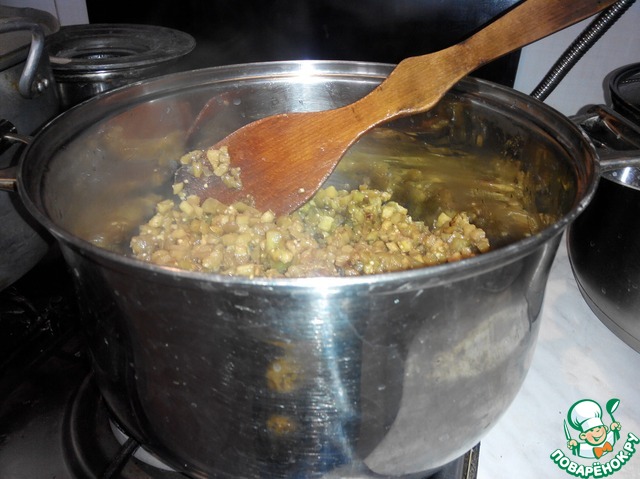 Вылить приправу в кастрюлю к баклажанам. Перемешать.
