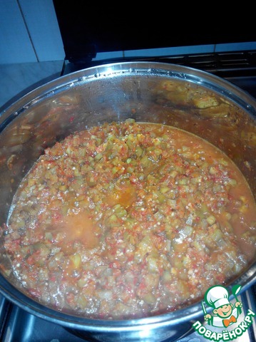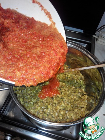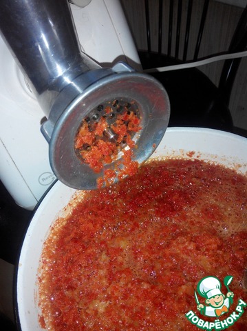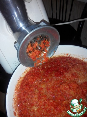Приготовить приправу: Помолоть на мясорубку перец сладкий красный 15 шт (я брала 10 шт. красного и 5 шт. сладкого желтого), чеснок, горький перец.