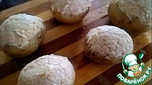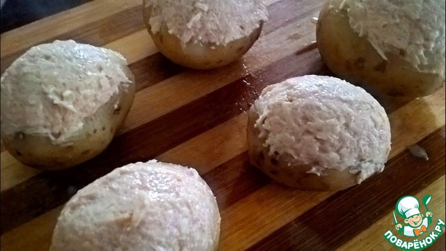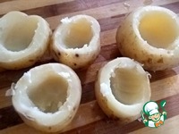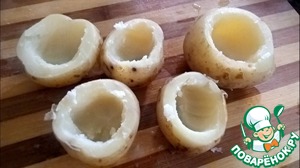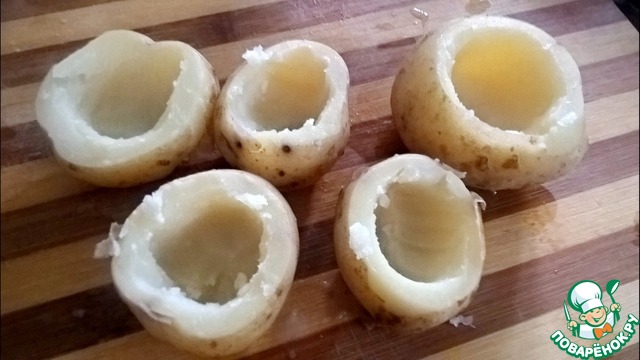 Картофель помыть и отварить в мундире в подсоленной воде Остудить и вынуть часть сердцевины. Картофель молодой и поэтому кожицу можно не снимать |
