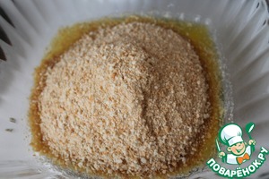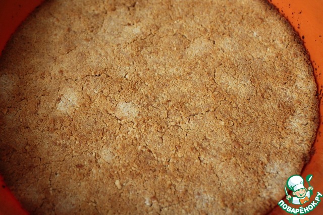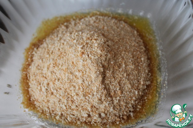 Печенье раскрошим и смешаем с растопленным сливочным маслом.