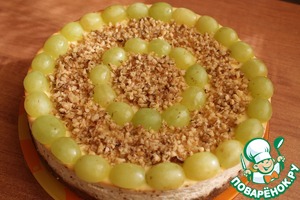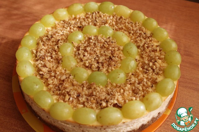 Украшаем пирог половинками винограда без косточек, мятой и измельченными грецкими орехами.