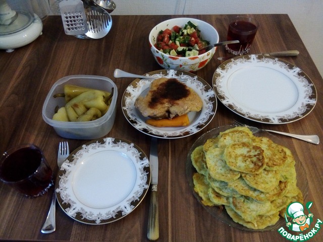 Оладьи получаются очень нежные и сочные. Летом у нас такие оладьи играют роль и хлеба, и гарнира. Если несколько штук остаются, прогретые в микроволновке на второй день вполне съедобны. Приятного аппетита! Композиция называется «летний ужин»)))
