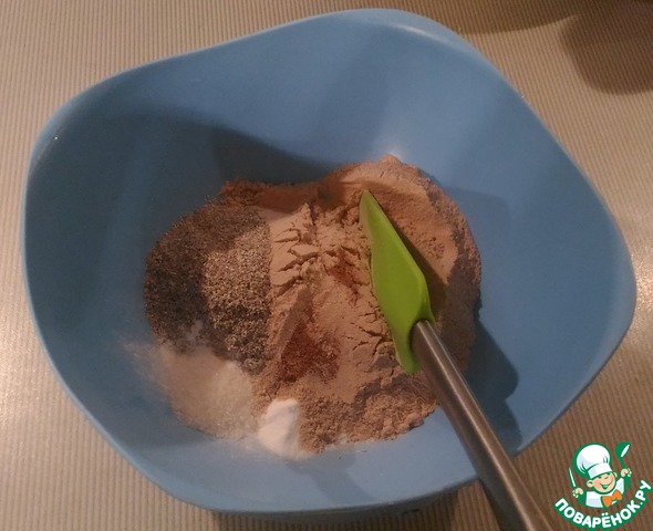 Смешиваем сухие ингредиенты - гречневую муку, отруби, разрыхлитель, соду (не гасить, за нас это сделает йогурт), ванилин, специи (если добавляете).