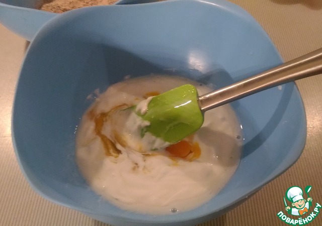 Отдельно соединяем йогурт и яйца до однородной консистенции - можно вручную, и блендер задействовать не нужно!