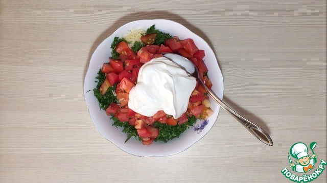 1. Нарезать мелко ветчину, помидоры, зелень.
