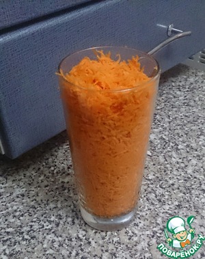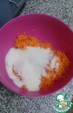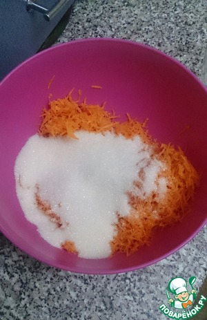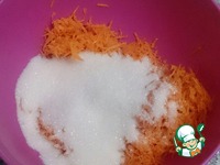 Соединяем морковь с сахаром, перемешиваем. Ждем минутку, чтоб морковь дала сок. |