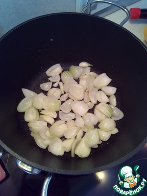 Лук крупно порезать, слегка обжарить на оливковом масле