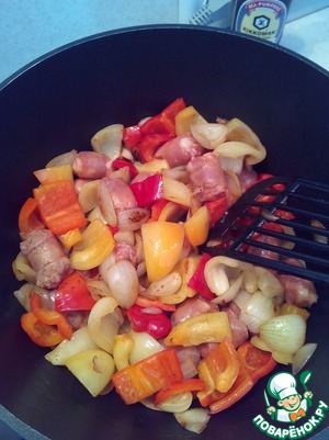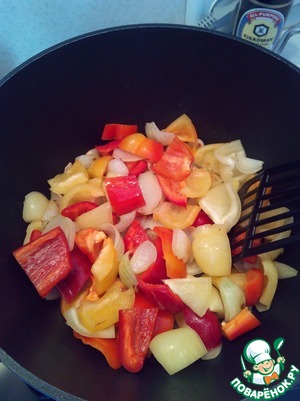 К луку добавить крупно порезанный перец, обжарить