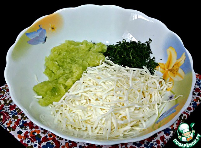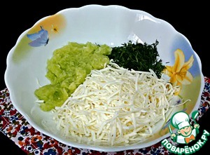 Огурцы хорошо отжать от жидкости, у меня в итоге получилось 48 г жмыха. Укроп мелко порезать. Сыр натереть на мелкой терке. Перемешать.