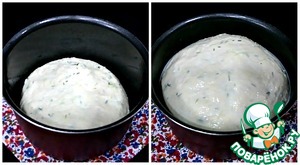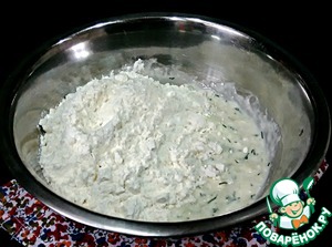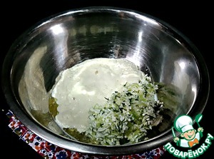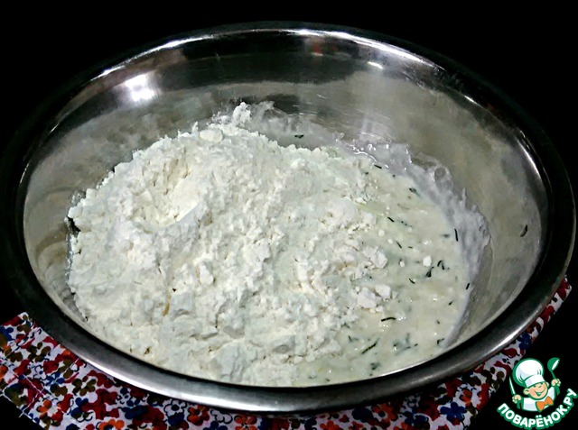 Тесто. В теплом молоке распустить дрожжи, добавить соль (1/4ч. л.), растительное масло, опару и огуречно-сырную массу. Тщательно перемешать.