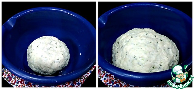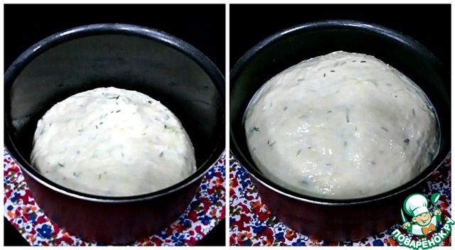 Тесто скатать в шар, положить в емкость, смазанную растительным маслом, и убрать в теплое место до увеличения в объеме. У меня поднялось за 50 минут.