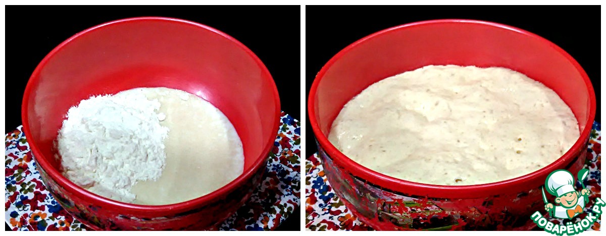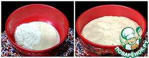 Добавить 2/3 муки и начать вымешивать тесто. Муки может уйти больше или меньше, ориентируйтесь по своей. У меня ушло 230г муки.