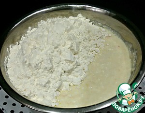 Добавить опару и перемешать. -