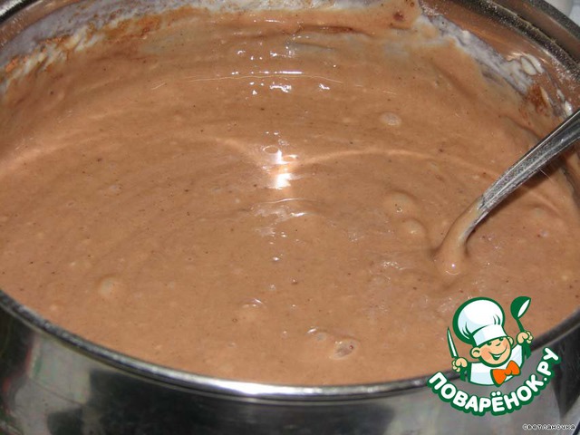 Добавляем муку и какао (я его добавила, чтобы порадовать своего старшего сына, а так можно печь и без какао), ещё раз вымешиваем. Полученное тесто выкладываем в форму, смазанную маслом. У меня тефлоновая форма, но и то, после выпечки пирог не очень хорошо отделяется.