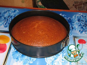 Когда немного остынет, разрезаем поперёк на 2 или 3 части и смазываем любимым кремом (взбить сметану с сахаром в моём варианте). Если украшать не хотим, то крема на верх выкладываем много, если хотим, то чуть-чуть.