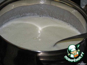Соду гасим в кефире (подождать минут 5 -7, чтобы кефир запузырился и увеличился в размере).