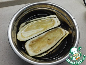 Для того, чтобы подготовленные баклажаны не потемнели помещаем их в миску с соленой водой.