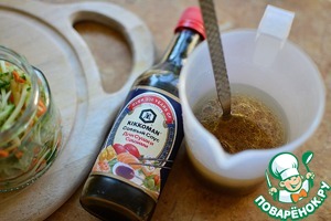 Заправку лучше делать на свой вкус, так как он у всех разный, к данному количеству масла по вкусу добавить уксус, соевый соус и сахар, сколько добавила я - я указала;