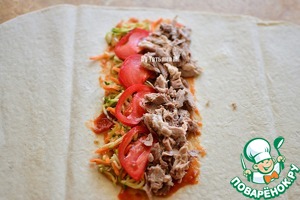 Серединку лаваша смазываем соусом, выкладываем вилкой салат, дольки помидора, мясо; -