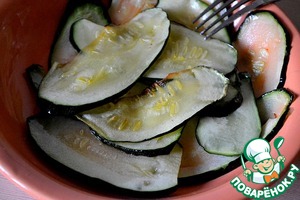 Тоненько нарезаем кабачок, у меня молоденький цуккини.