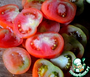 Пока жарятся кабачки, нарезаем кружками помидоры