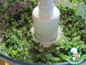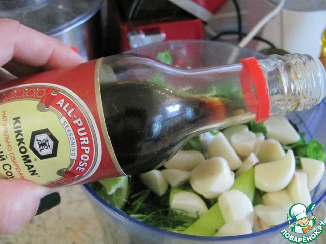 Сложить в чашу фуд-процессора два вида перца, зелень, чеснок. Добавить соевый соус.