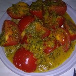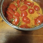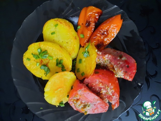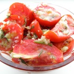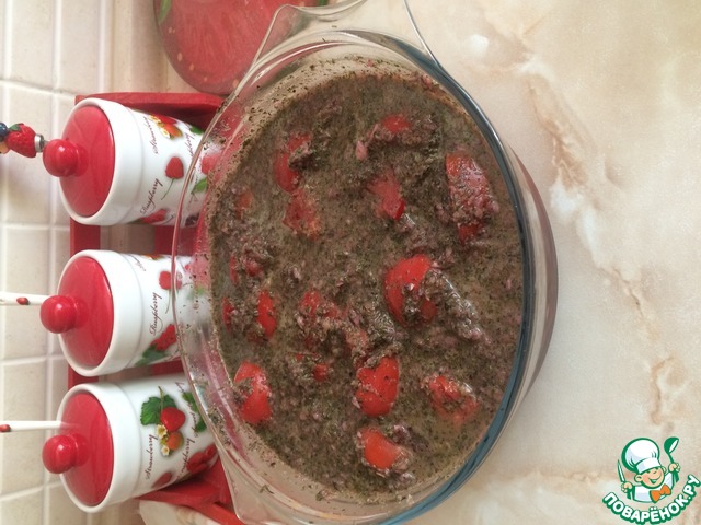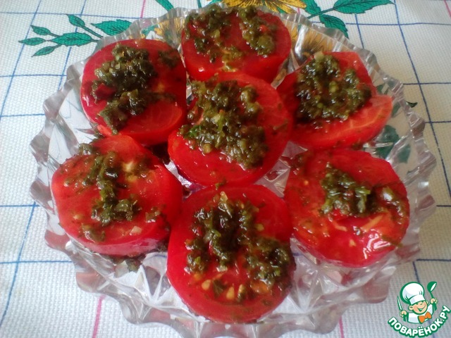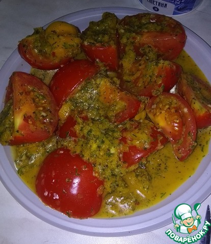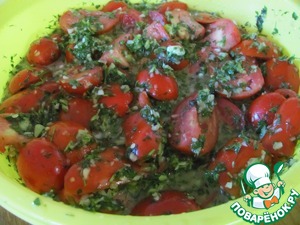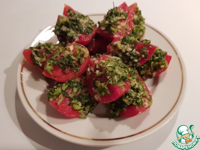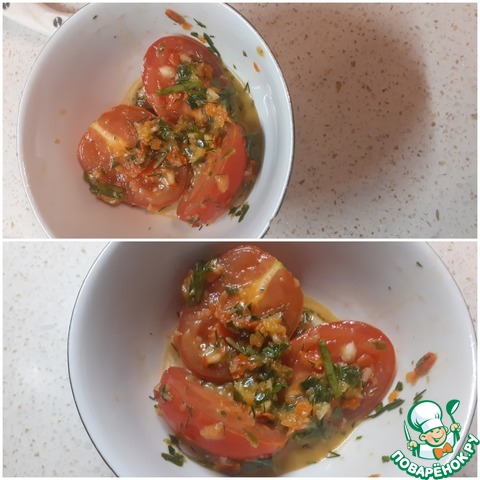 В следующем шаге можно пойти двумя путями. Просто высыпать заправку и аккуратно перемешать, или выложить ряд помидоров срезом вверх и выложить часть заправки. На заправку положить еще ряд помидоров срезом вниз и опять выложить заправку. Я просто перемешала и перевернула помидоры срезом вниз. Закрыть помидоры крышкой или затянуть пищевой пленкой. Поставить в холодильник на 12 часов.