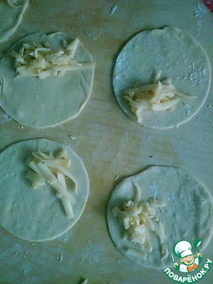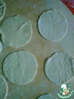 Раскатать тесто тонко и вырезать кружочки диаметром 10 см примерно