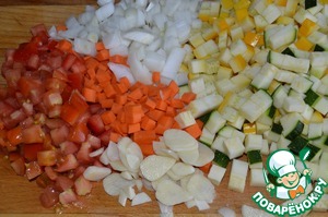 Кабачки, лук, морковь и помидор нарезать кубиком, чеснок пластинками.