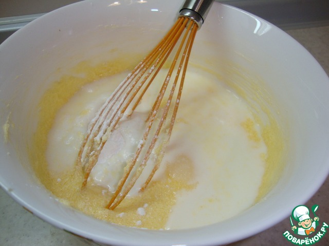 Влить в полученную массу молоко и всыпать ванильный сахар и соль. Размешать массу.