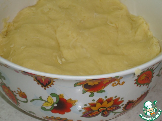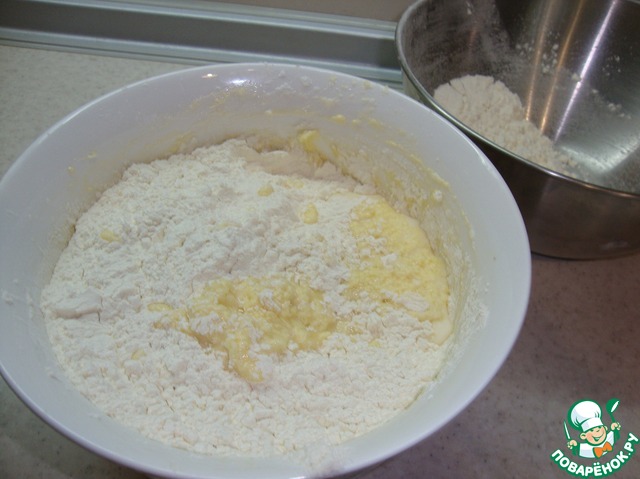 Затем всыпать большую часть просеянной муки с рызрыхлителем и постепенно добавлять оставшуюся муку при замесе теста. Может понадобиться и чуть больше. Я добавила ещё одну столовую ложку.