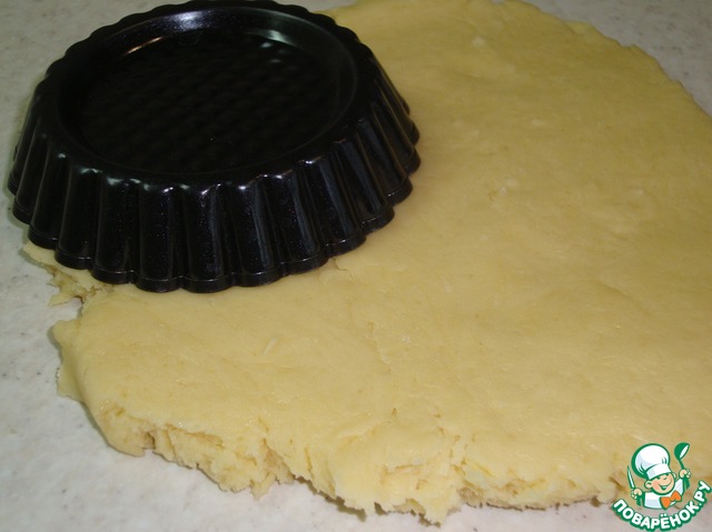 Раскатать пласт теста, толщиной примерно 7 миллиметров. Кожики можно вырезать любой имеющейся у вас формой.