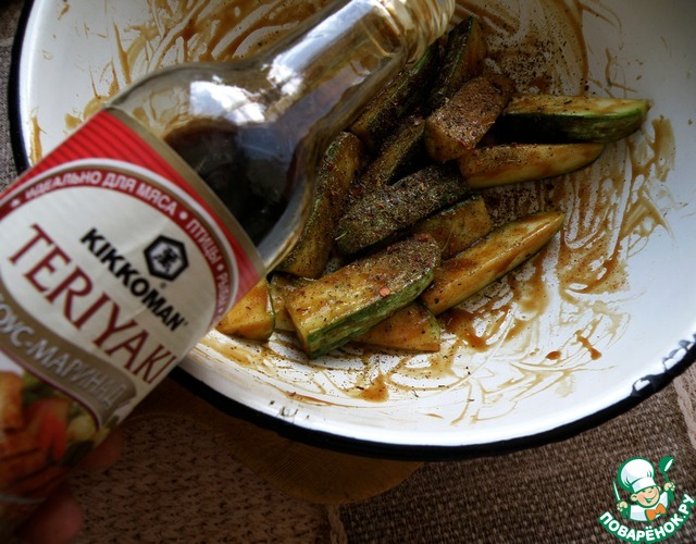 В просторной миске полить кабачок соусом «Терияки» ТМ «Киккоман» и добавить немного сладкого соевого соуса. Посыпать кабачки любимыми пряными травками, хорошо перемешать. В этот раз я взяла по щепотке сухого орегано, петрушки, чесночного порошка, тимьяна и черного перца. Смесь ароматных приправ может быть любой, по вашему вкусу и настроению. очень вкусно добавить любую паприку или взять карри.