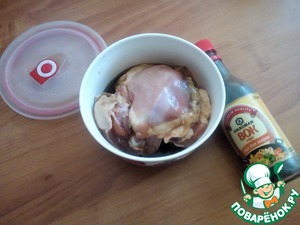 Я бёдра замариновала на ночь. Помыла, сняла кожу, обсушила и просто залила соевым соусом. Накрыла крышкой и поставила в холодильник. Можно их замариновать минут на 20-30.