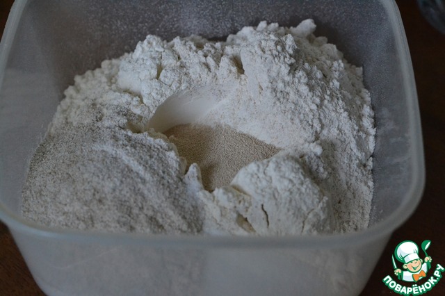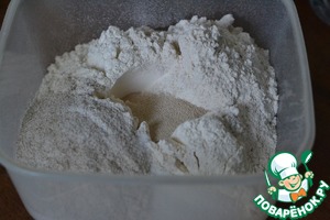 Смешать муку, соль и дрожжи.