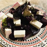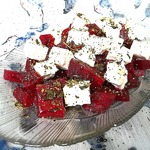 Приправить свеклу душистым перцем. Базилик измельчить и выложить сверху. Фету нарезать небольшими кусочками, выложить на базилик, приправить черным перцем.