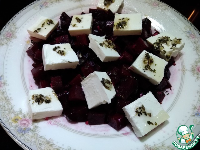 В чашечке смешать винный уксус, оливковое масло и чесночный порошок. Заправить свеклу, оставить 1ч. л. соуса для Феты