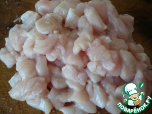 Помешивая, доводим куриное филе до готовности. Как только куриное мясо побелело, ждем еще минуты две, чтобы кусочки куриного филе приготовились по всему своему объему и выключаем огонь под сковородкой.